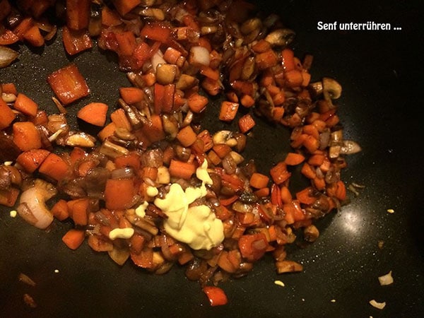 - währenddessen Möhre, Paprika, Pilze (falls nicht getrocknet) und Räuchertofu klein schneiden und in einer Pfanne kräftig (!!) anbraten – wirklich knackig anbraten, nur nicht verbrennen lassen